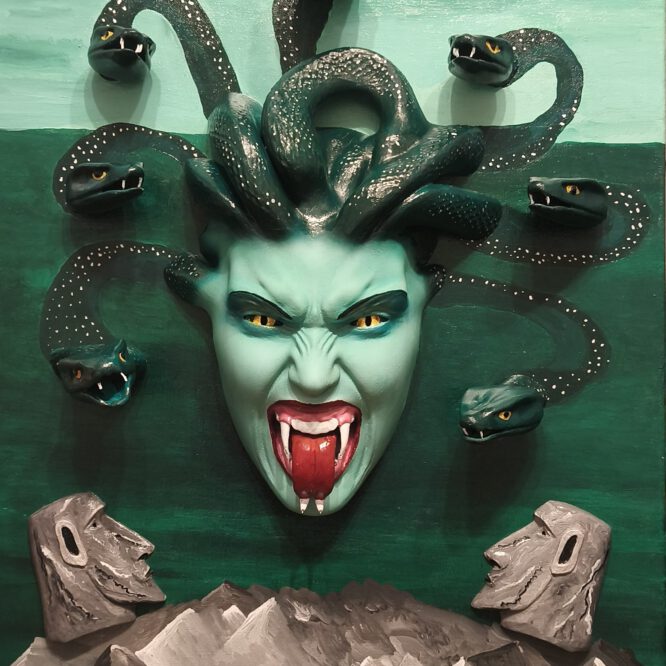 Acryl auf Leinwand mit 3D gedruckter Medusa und Moais – die Köpfe der Osterinseln. So wie es aussieht ist das